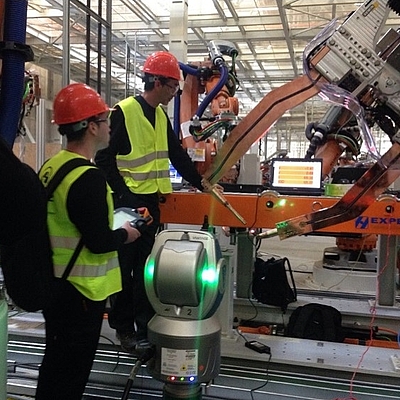 Laser-based 3D measurement technology is used to turn this ideal idea into reality. It is the most economical approach for this. It offers a higher-level measuring system - by the use of a laser tracker - with a measuring accuracy of 0.01 mm/m and a flexibility that allows a setup in almost any environment in which industrial robots are used.